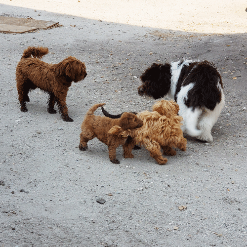 To start each week Daisy visits her breeder at Loveable Labradoodles in Templeton. This is a special time for her as Daisy is able to experience play with pups, mostly, her size. This particular week the owner had her miniature pups out when we pulled up. So Daisy experienced being the BIG dog for once. I noticed that Daisy played very gentle with the pups even though they were very playful in exchange. Now this is not something we trained, she just naturally understands to adjust her play depending upon her playmate. When she plays with trainers Alec and Madi, Daisy goes all out!