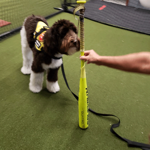 Daisy experienced yet another unusual environment this week. Anytime we can expose her to these new places, the better she becomes ignoring distractions. Check out the photos of Daisy in the Baseball Training Warehouse of Paso Robles.