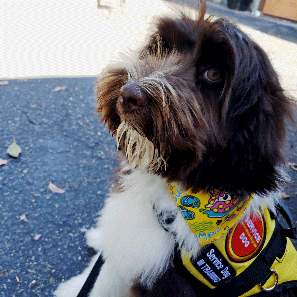The new skill is called "NOW!". This, hopefully, will not be used too often. Daisy's client uses a walker and at times feels like some people walking toward her are not paying attention. This fear has caused some intense moments. Daisy's job? With the command, "NOW!" Daisy will quickly move in front of the walker and create a safe space between oncoming people and the client. As needed, Daisy will know when to bark if someone comes too close.