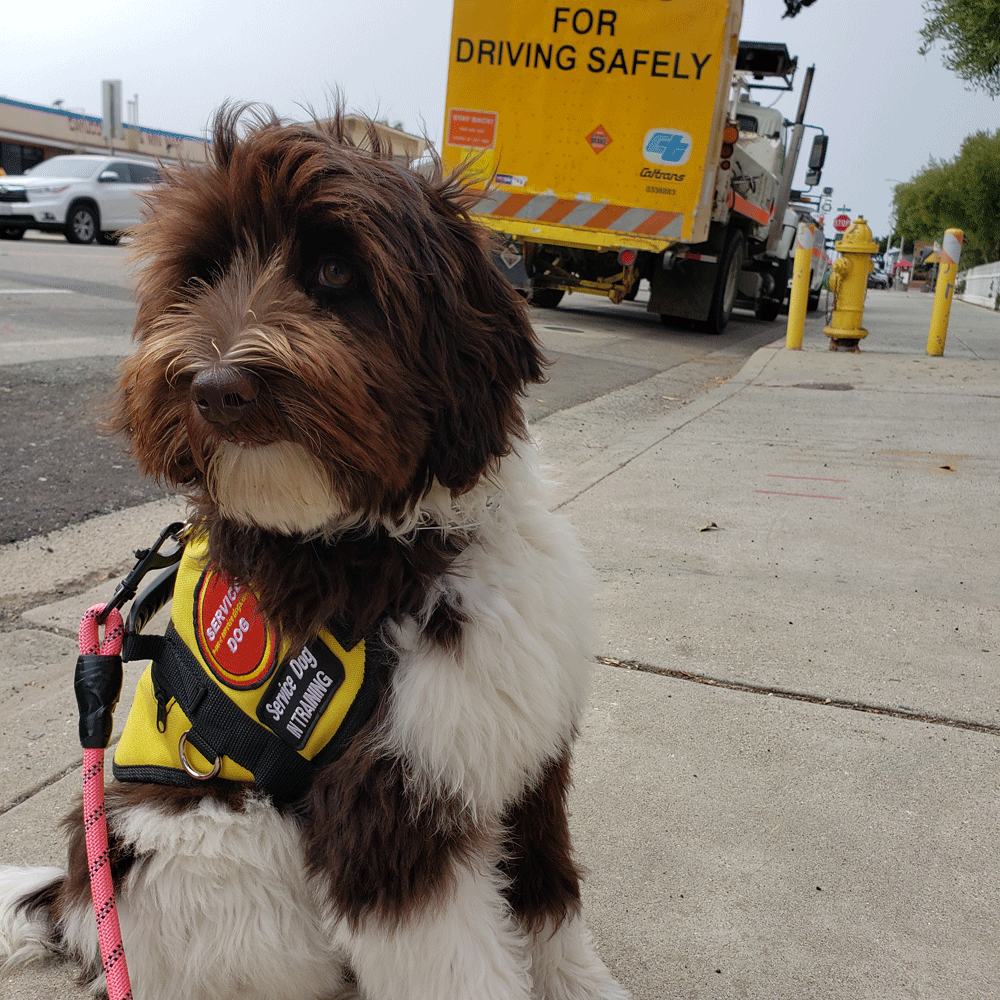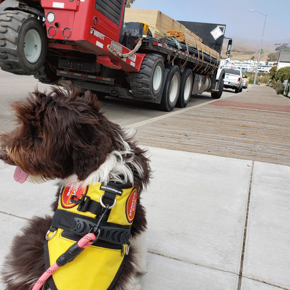 One such walk in Cayucos provided plenty of opportunities. As it turned out, the streets were crowded with large trucks of various kinds. Daisy is not crazy about big trucks and the noise. Little by little she is coming around where once she cowered at the noise and motion of big trucks, to now stopping and sitting at my feet. When this happens I stop and talk her through the event. Daisy is still unsure, but doing much better.